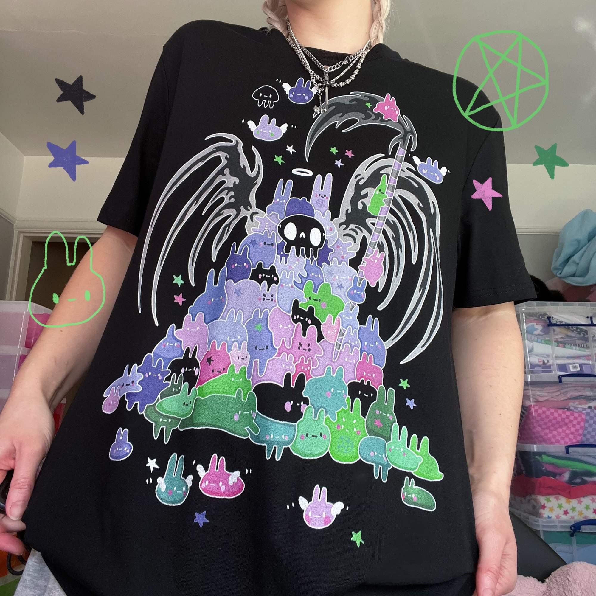 The tee is a soft spun tee that is vegan approved and organic. There is a large print on the front, and little bunnies on the back.