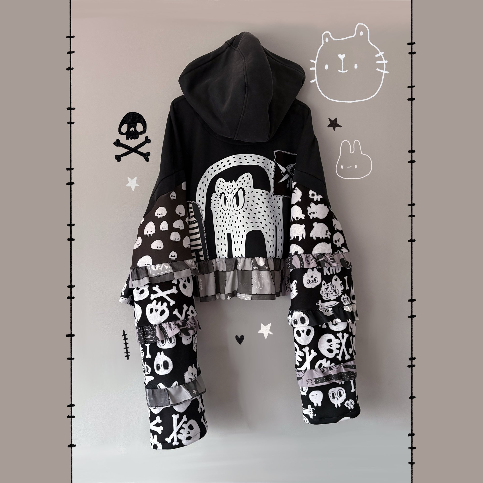 A frilly printed CATS RULE one off piece. All front and back pieces, fabric and patches are fully designed by me.