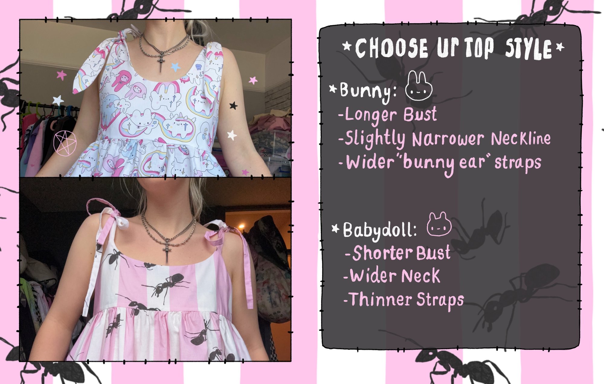 -Check out slide 2 and 3 to see the differences between the top styles. The ‘babydoll’ top style features skinnier straps, a wider neckline and a shorter bust, the ‘bunny ear’ top has wider straps and a slightly longer bust.