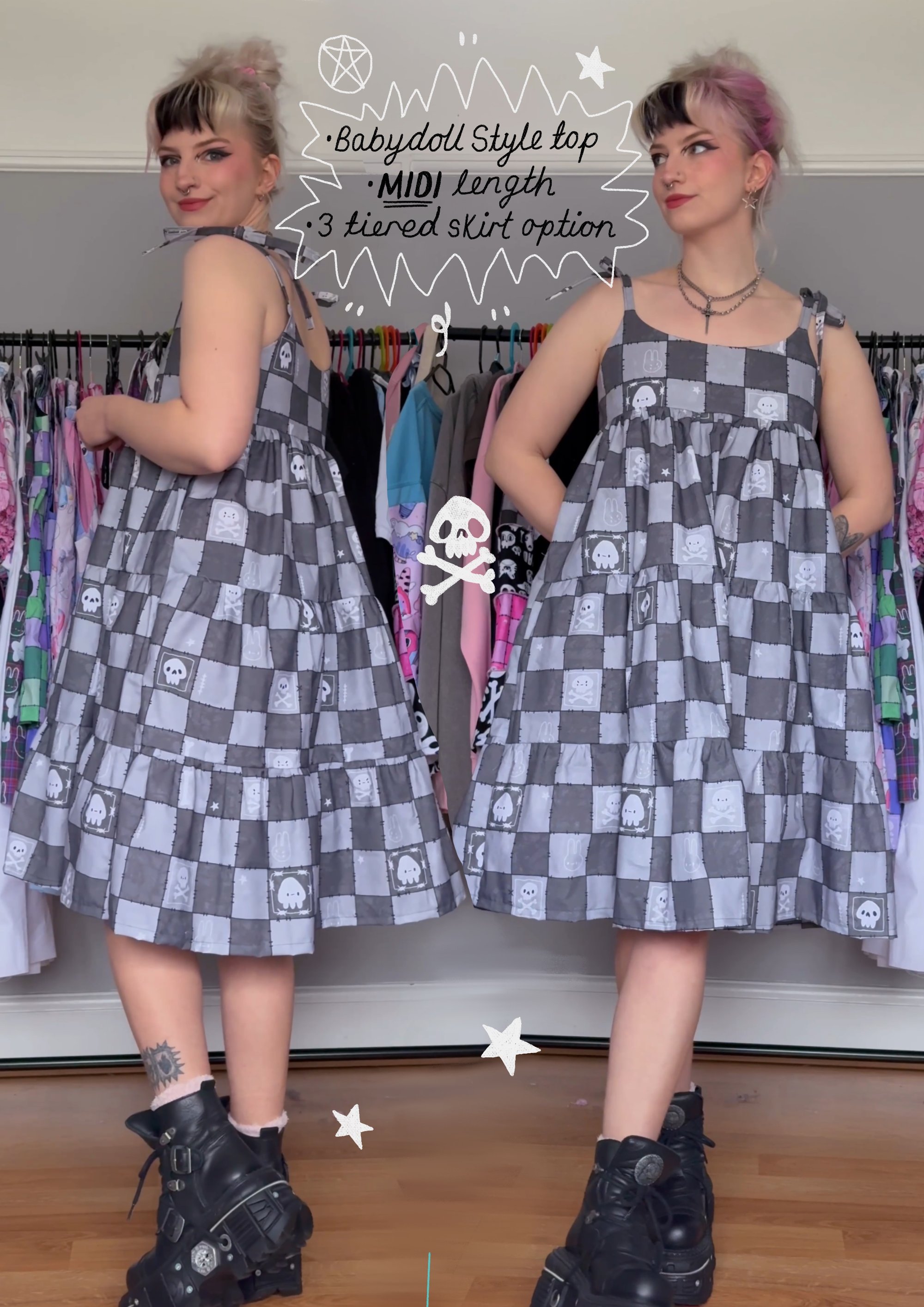 -All dresses are made by me, in my home studio, with true love and passion for sustainably made alternative fashion. I only order fabric for orders after they come in, so I limit the amount of waste as much as possible.