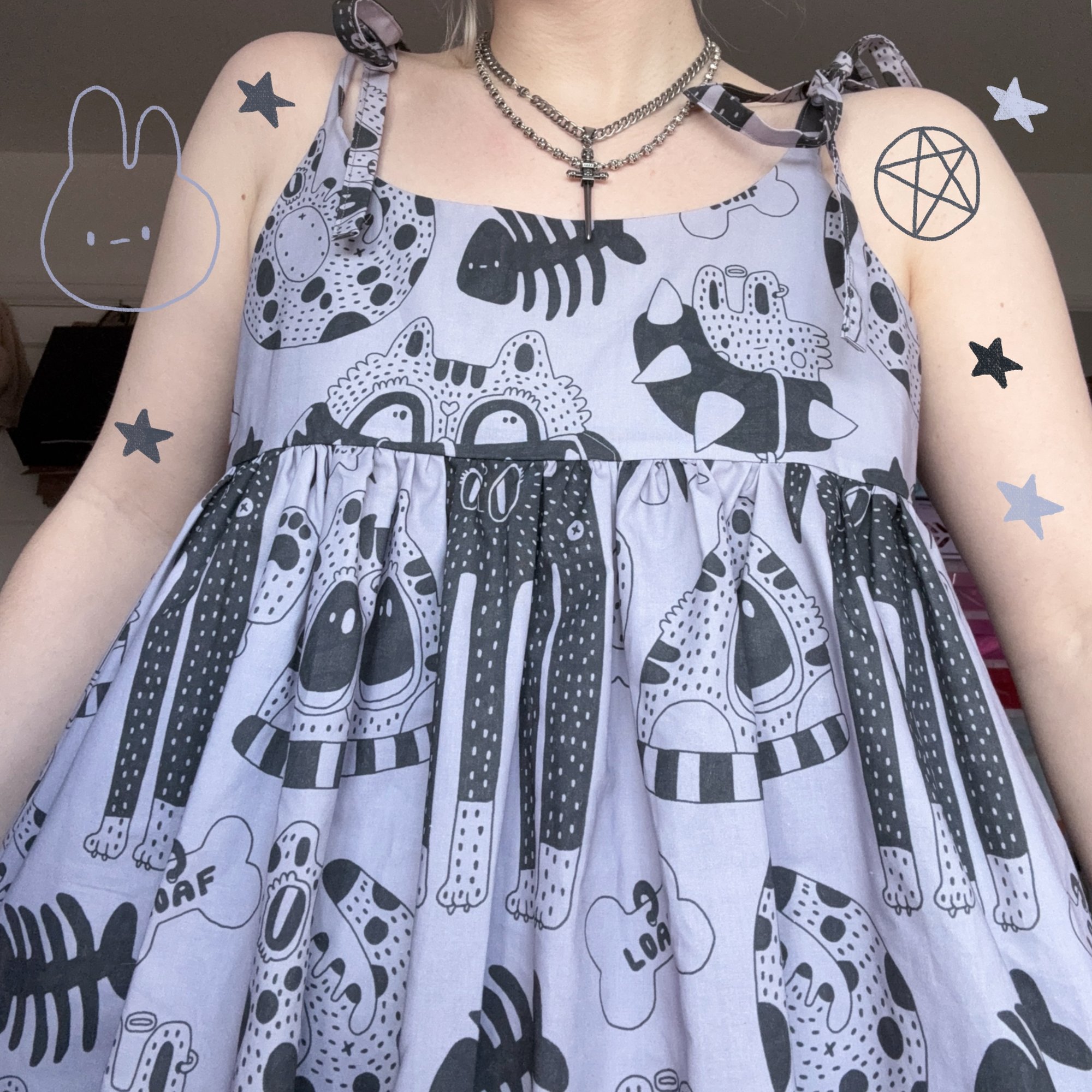 -All dresses are made by me, in my home studio, with true love and passion for sustainably made alternative fashion. I only order fabric for orders after they come in, so I limit the amount of waste as much as possible.