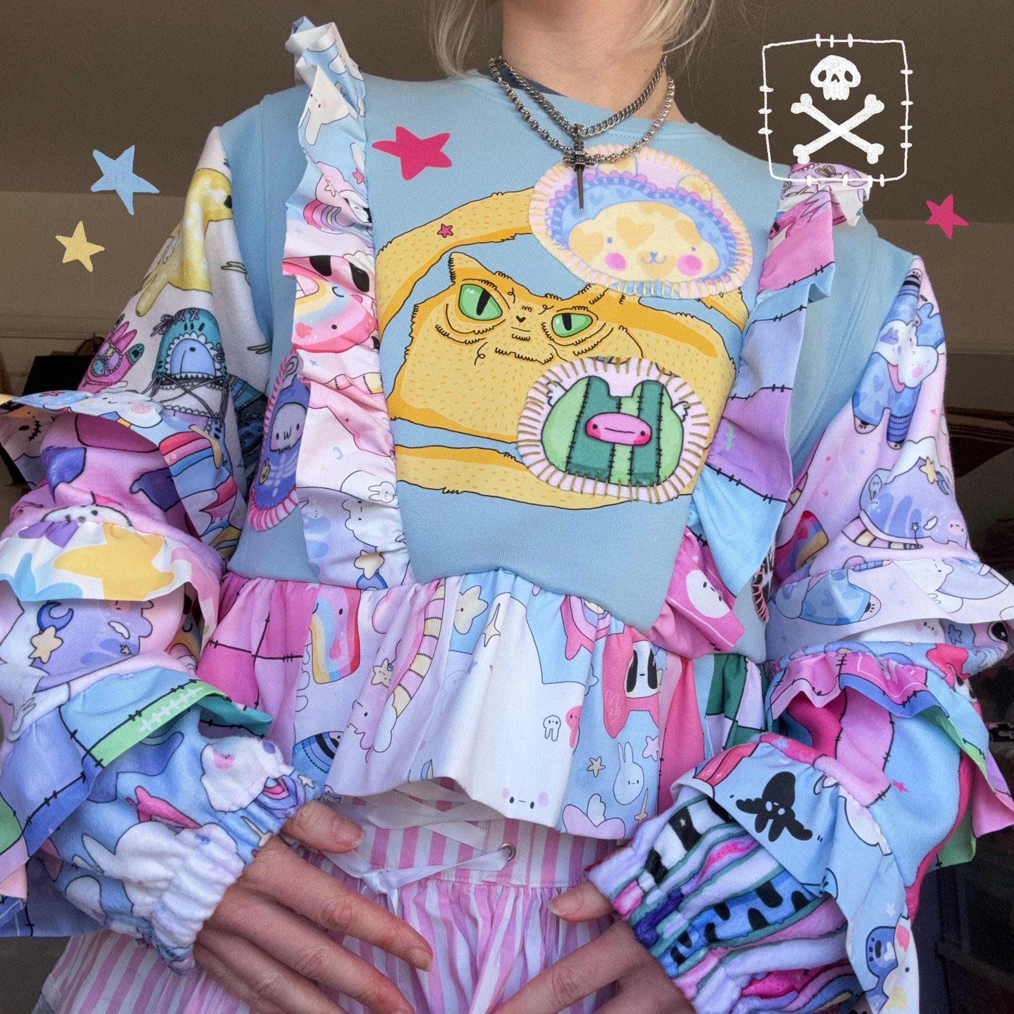 A MEGA frilly printed kitty one off piece. All front and back pieces, fabric and patches are fully designed by me.